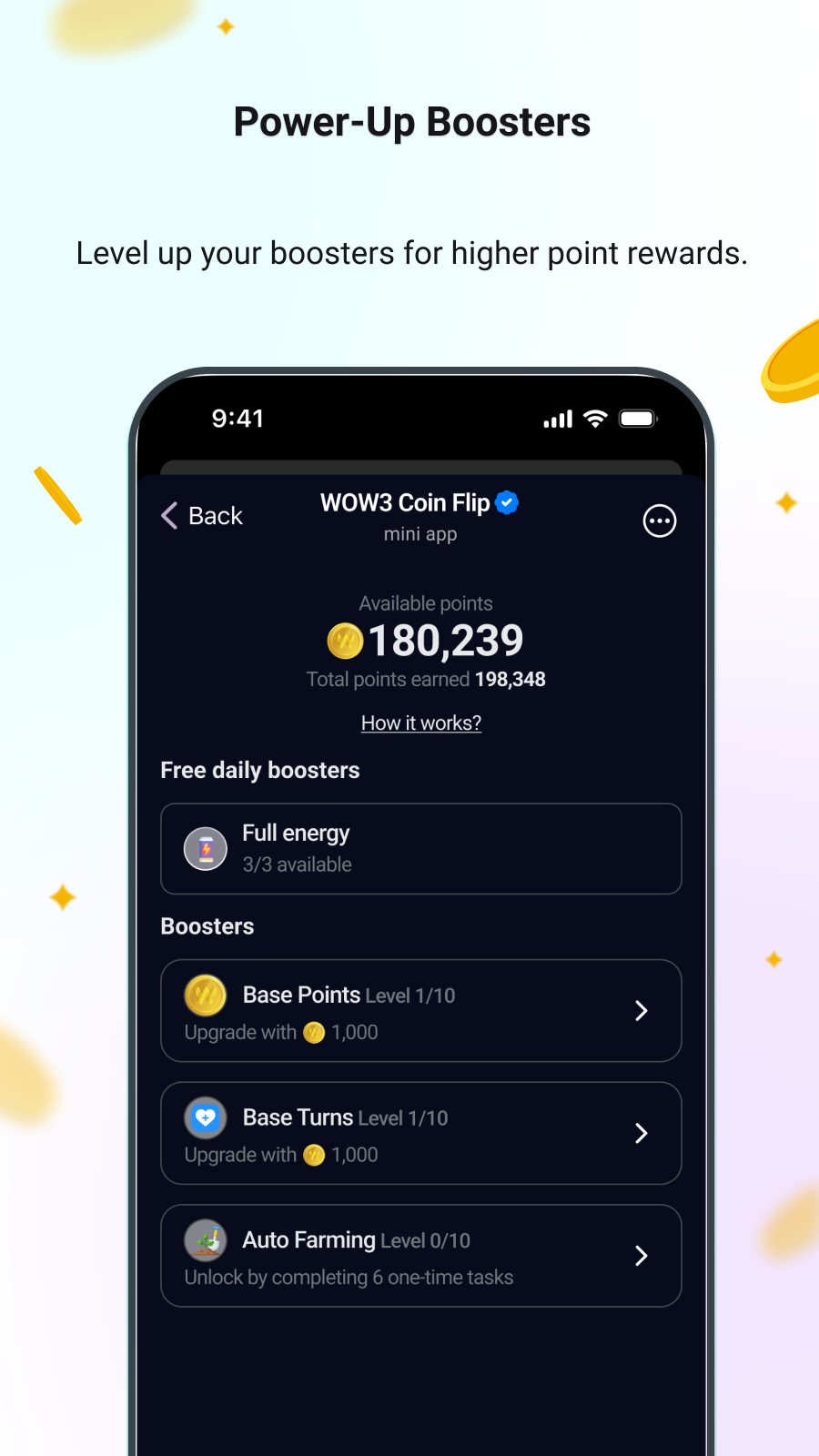 In WOW3 Coin Flip, Base Turns represent the number of turns you can play in each game session. Upgrading your base turns increases your gameplay opportunities. Hereโs how the upgrade process works: