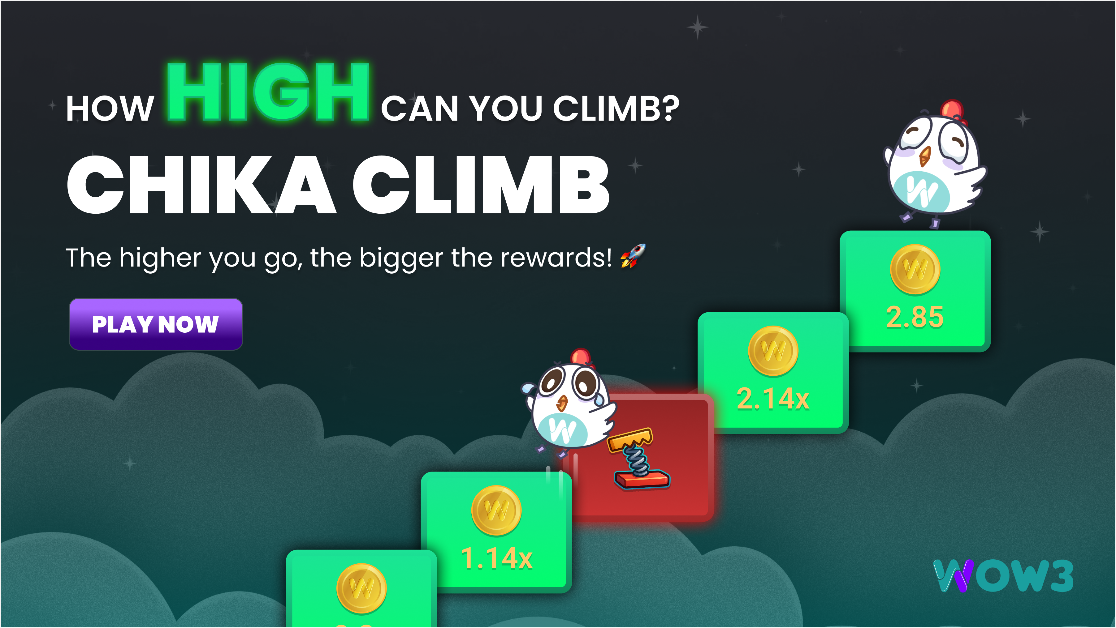 Chika Climb is a high-risk, high-reward WOW3 mini-game where players guide **Chika** up a tower by choosing safe tiles while avoiding hidden traps. Each correct move increases both the difficulty and the potential reward.