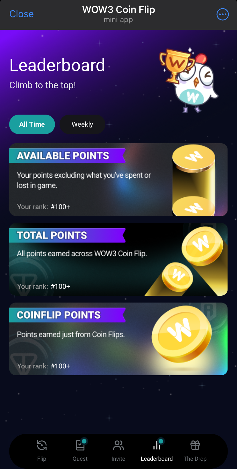* **Overview**: Earn points for referring new users to WOW3 Coin Flip. The top 50 referrers each week will be ranked based on confirmed referrals.