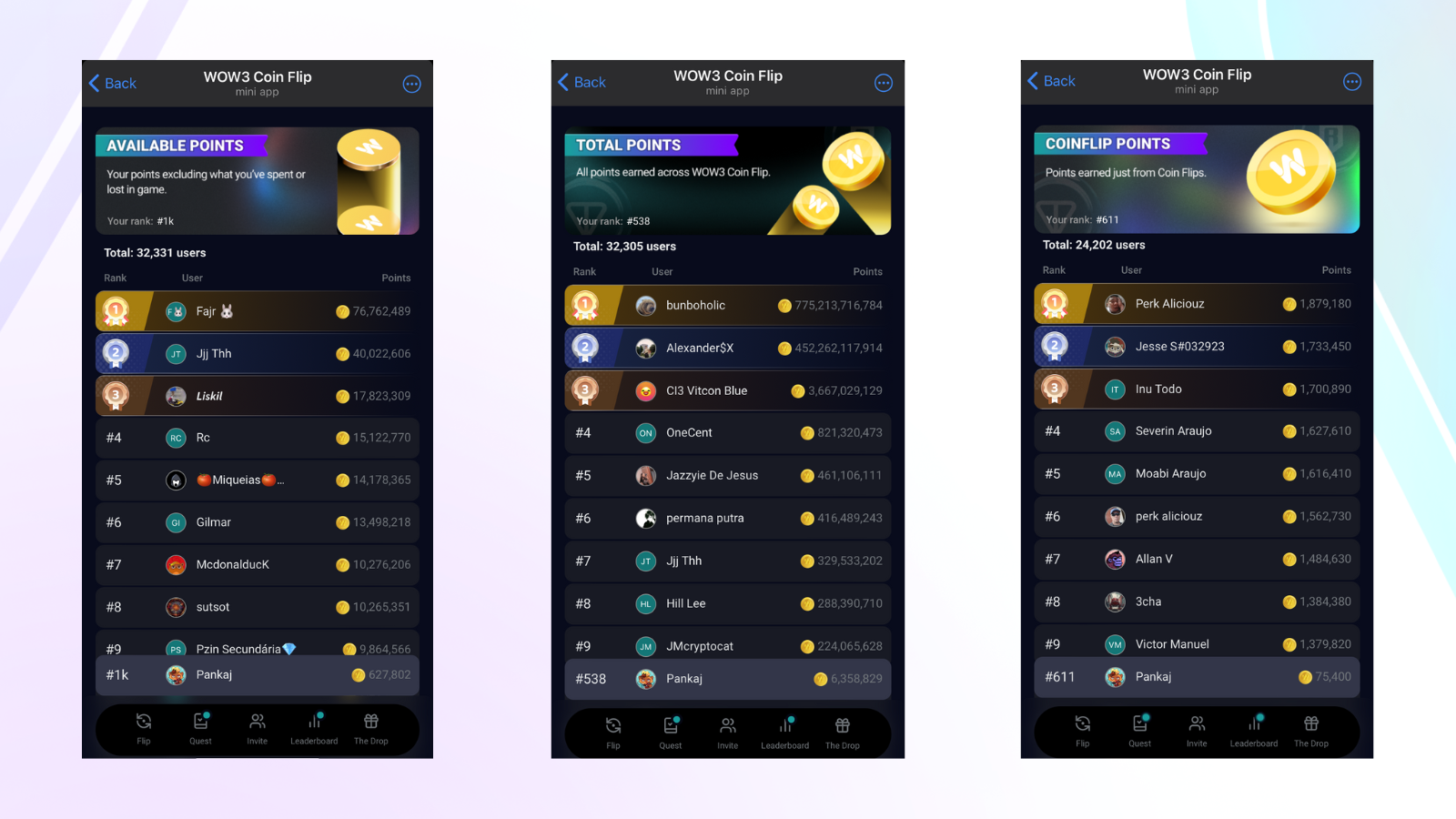 #### 3. **Coin Flip Points Leaderboard**
