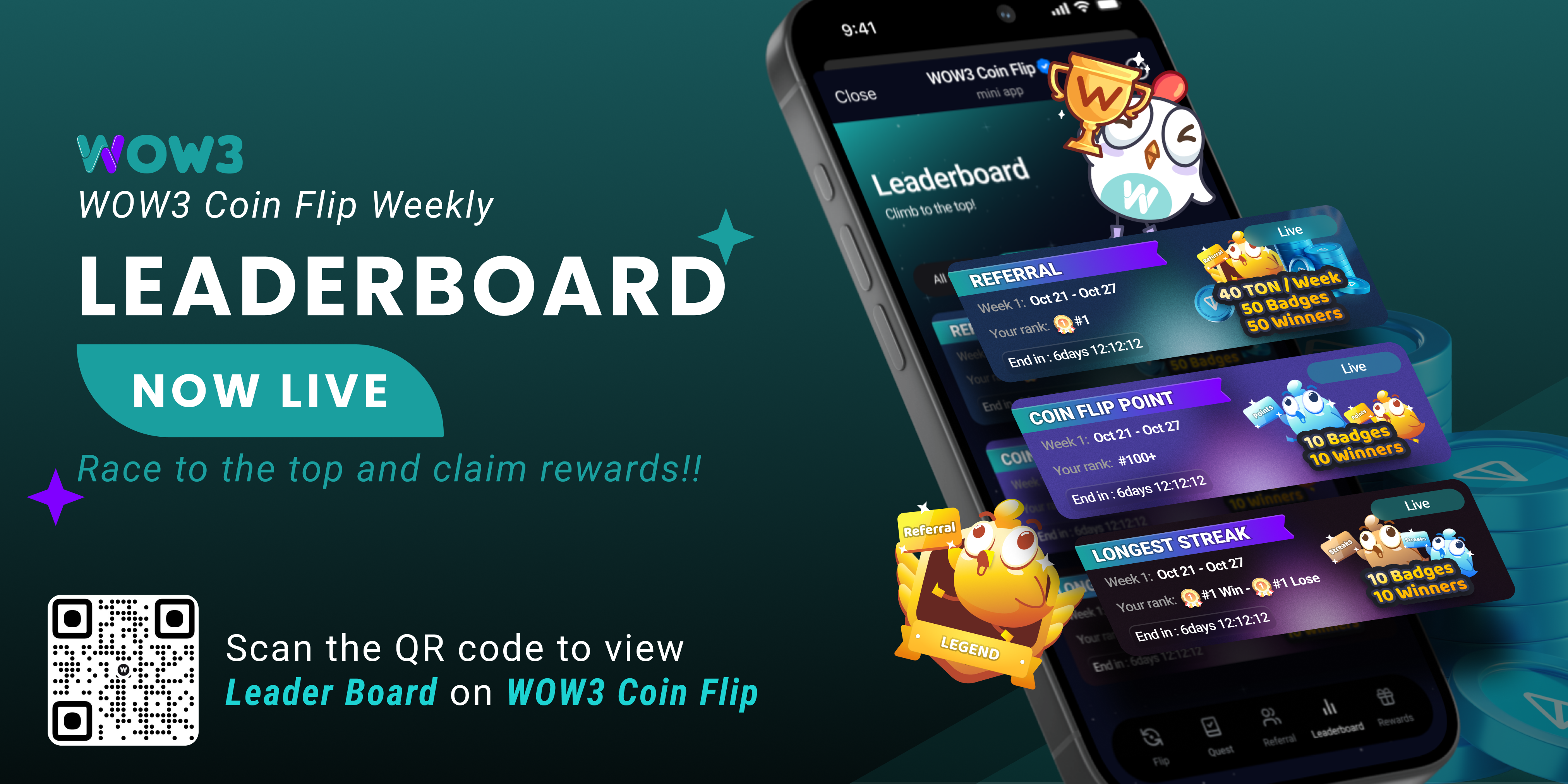 We’re excited to introduce **three new Weekly Leaderboards** for WOW3 Coin Flip, giving you even more ways to earn rewards and showcase your skills. These leaderboards will reset every Monday at 12:00 AM UTC, and winners will receive exclusive rewards, including **TON prizes** and **NFT badges**.