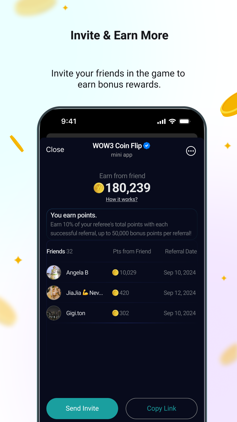 * Earn 10% of each friend's total points, up to 50,000 bonus points per friend.